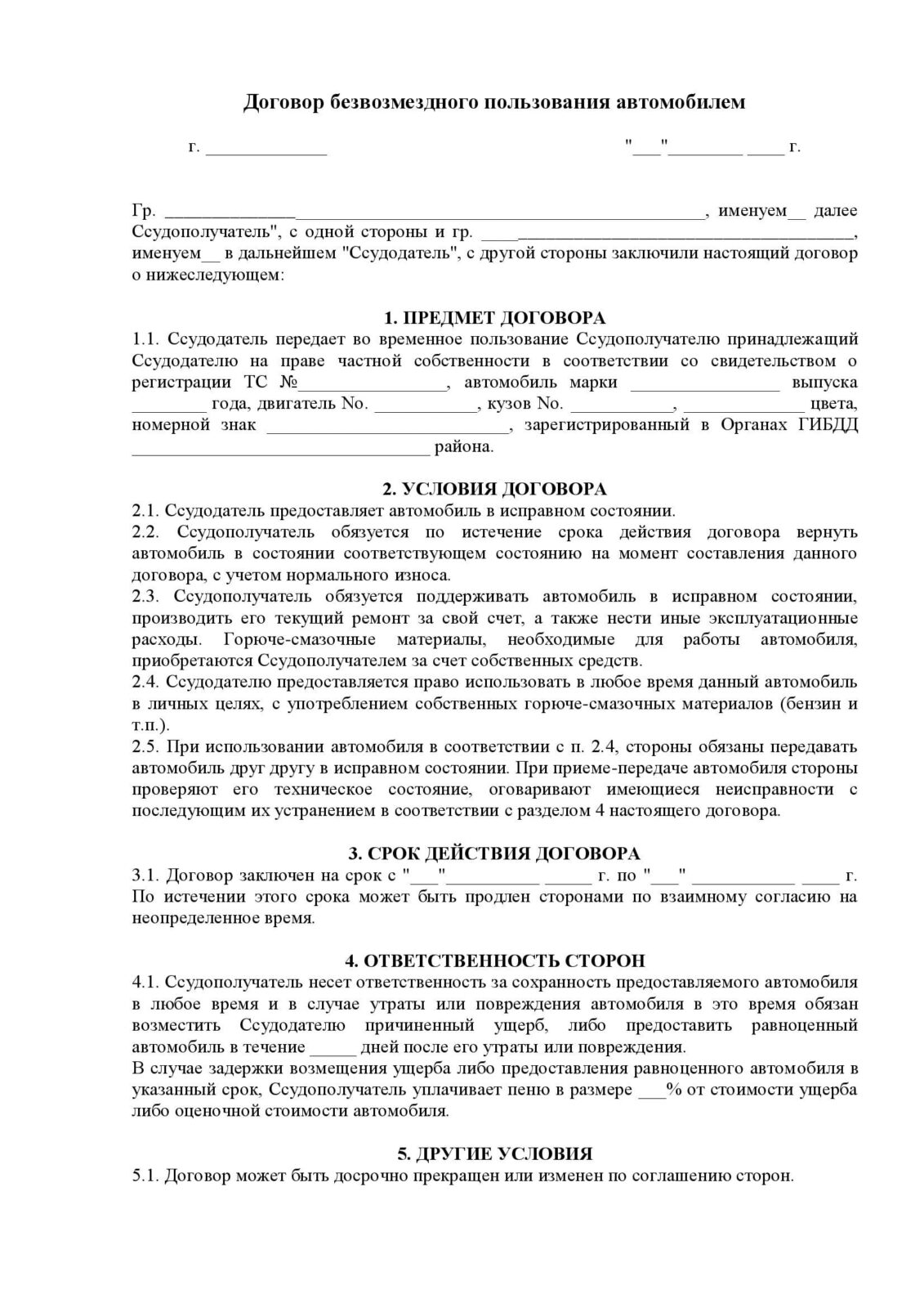 Скачать пустой бланк договор безвозмездного пользования автомобиля