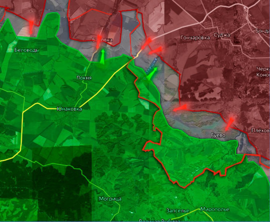 На Курском направлении российские подразделения захватили Басовку в Сумской области и развивают наступление в сторону Юнаковки. Одновременно отмечается почти полное вытеснение украинских войск из населённых пунктов Олешня и Гуево в Курской области — в каждом из них под контролем ВСУ остался лишь один опорный пункт. В Гуево это укреплённый узел в районе разрушенного спиртзавода, где украинская сторона удерживает позиции с применением снайперов и пулемётчиков. Однако данный участок изолирован от основной линии снабжения, особенно с запада, что фактически превращает его в тактический «котёл» с ограниченной боевой устойчивостью.