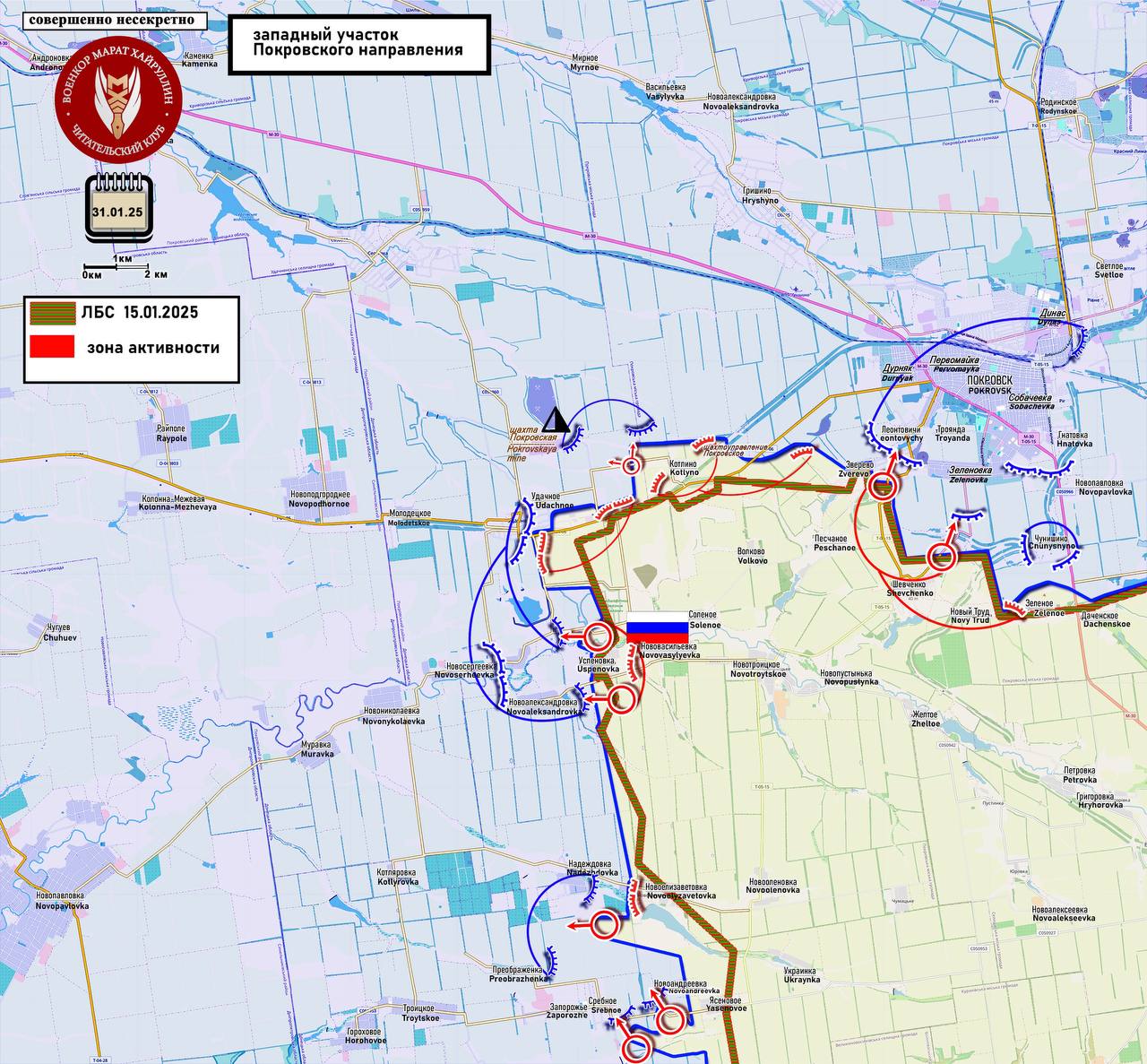 В Андреевке ВС РФ расширяют зону контроля в северо-восточной части, продвигаясь к центру села. Противник был также выбит с ряда опорных пунктов восточнее Андреевки. Кураховский карман постепенно сжимается как в районе горловины, так и внутри. ВСУ откатываются в западную часть н.п. Дачное, а со стороны реки Сухие Ялы наши подразделения, расширяя контроль и оказывая давление с тыла, продвигаются всё ближе к дороге Дачное — Улаклы.