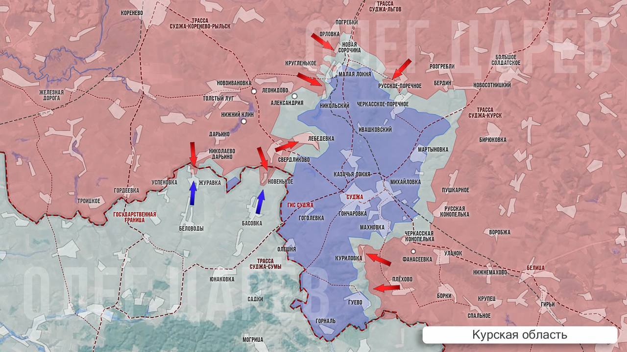 ВС РФ атакуют в Сумской области. Украинские ресурсы только сегодня признали, что ВС РФ перешли госграницу. ВСУ стараются не допустить перерезание трассы от Юнаковки на территории Сумской области до Суджи — ключевой точки обороны ВСУ в Курской области, но были разбиты на подходе и откатились. Сообщают, что в связи с критической ситуацией в Сумы прилетел главком ВСУ Сырский.