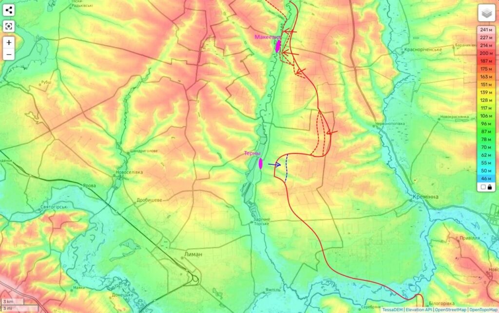 Российская армия продолжает развивать успех, который был ею достигнут накануне. Противник в районе н.п. Макеевка полностью отброшен за реку и пытается выстроить свою оборону на холмах западнее села.