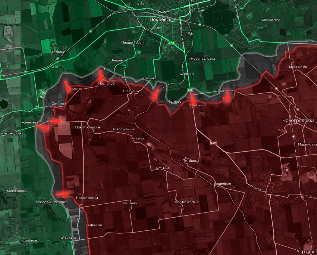 На Покровском направлении в западной части, южнее Покровской агломерации российские войска пытаются произвести охват Покровска.