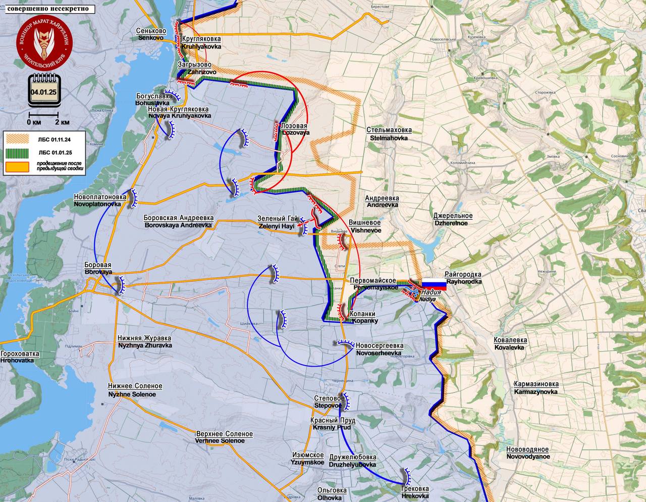 На подразделения ВСУ в н.п. Зелёное российские силы давят с запада, юга и востока, а также пытаются зайти им в тыл, пробиваясь к Чунишино, в направлении которого постоянно идут атаки вдоль железной дороги.