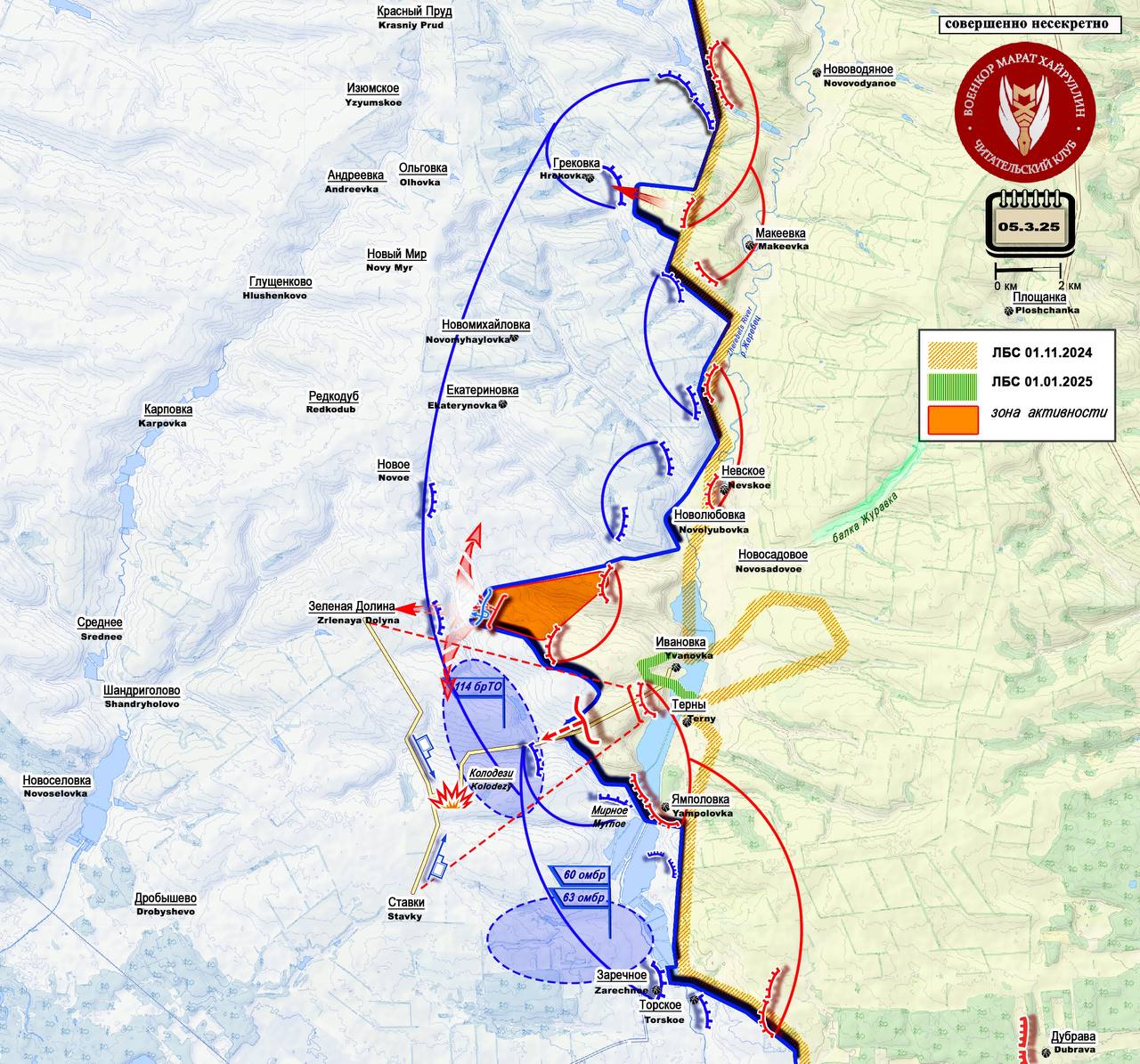 Более раннее продвижение на юго-запад от Макеевки в комплексе с продвижением на северо-запад от Ивановки может сформировать условия для выхода в тыл гарнизону ВСУ, окопавшемуся в районе Новолюбовки.