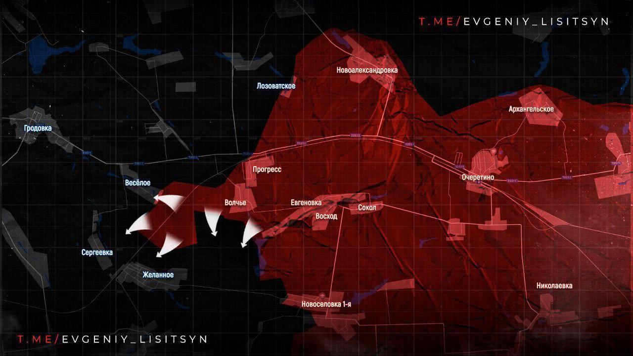 Продолжается движение российских сил у Ивановки, где противник отступил из центра поселка. Есть небольшие продвижение в лесополосах у Сергеевки и Межевого.