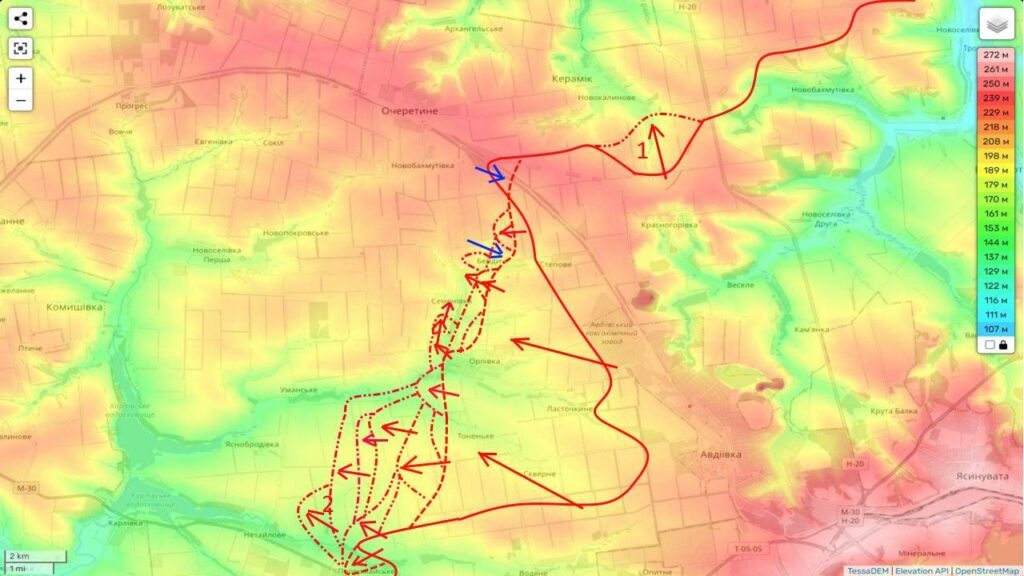 Севернее Авдеевки, где наши штурмовики смогли зайти на южные окраины Новокалиново и закрепились в районе ферм (1).