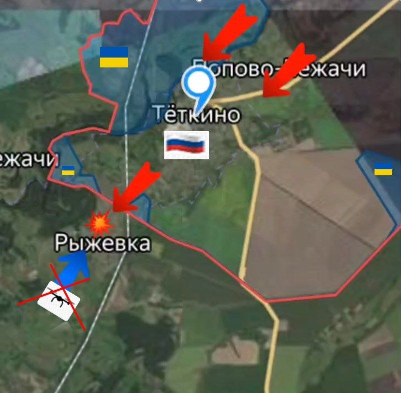 Курская область. Противник продолжает попытки прорыва в Курскую область. Наши провели ротацию и усиление в с.Тёткино. Сейчас идут попытки ВС РФ войти в с. Рыжевка. ВСУ сосредоточились в паре домов в селе. Ситуация сложна, но верим в наших ребят. Ждем новостей.