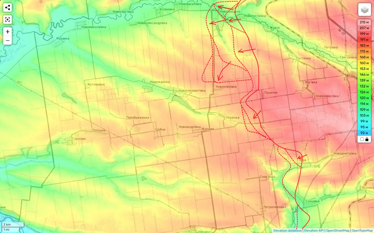 Здесь наши войска продолжали развивать свой успех, достигнутый накануне в районе севернее Новооленевки. Они продолжали вбивать клин в оборону противника и сумели заметно приблизиться к н.п. Новоелизаветовка.