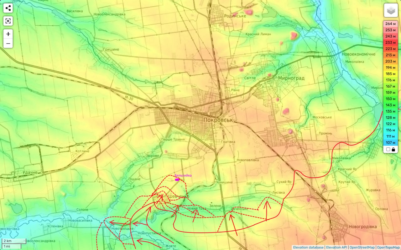 Вчера наши части, продолжая развивать наступление южнее Покровска, к вечеру сумели выйти в район н.п. Бельгийка и тем самым вышли уже практически на окраины г. Покровска, до которого им осталось пройти всего лишь одно поле (или 1,5 км).