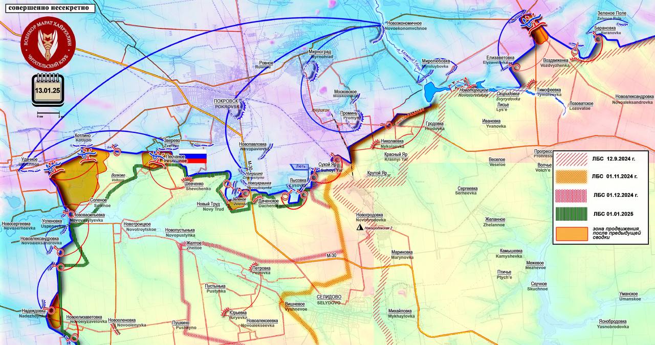 В н.п. Зелёное продвинулись как с востока, так зашли в него и с запада от железной дороги, вынудив противника вывести свои подразделения из кармана южнее н.п. Зелёное. Там под контролем российской армии находятся все лесополосы, и карман, существовавший там ранее, закрыт полностью. Давление на населённый пункт с трёх сторон позволило установить в нём наш контроль.