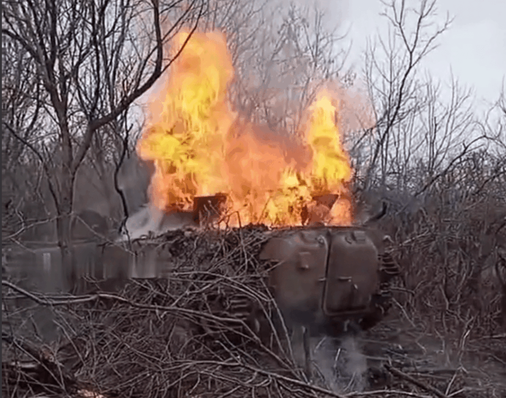Уничтоженный возле н.п. Хромово на Артемовском направлении украинский бронетранспортер БТР-4Е «Буцефал».