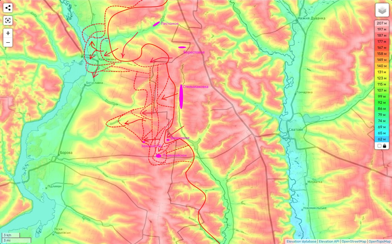 Здесь все с точностью до наоборот. Помните прорыв к Осколу. Он ведь тоже шел не по холмам, а по низине через н.п. Песчаное. Холмы вокруг брались под контроль уже потом.