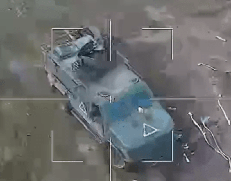 Кадры объективного контроля уничтожения барражирующим боеприпасом «Ланцет» инженерной машины разграждения ВСУ возле границы с Курской областью
