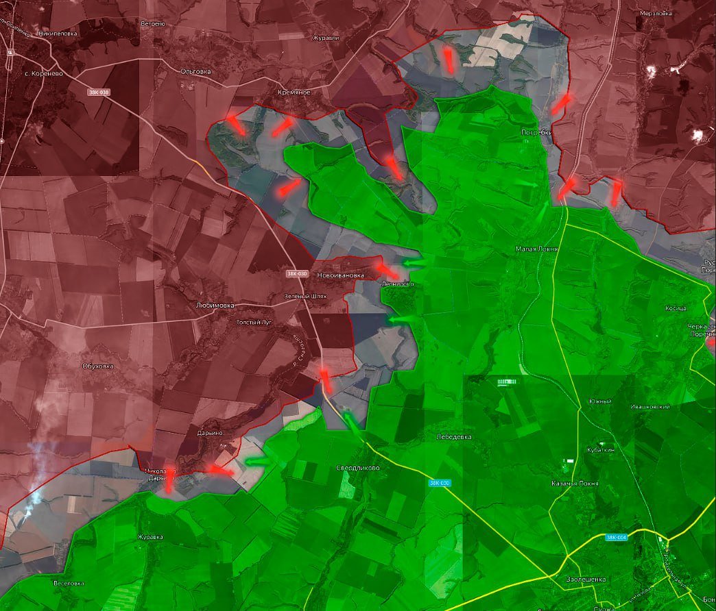 На Покровском направлении фиксируются атаки ВС РФ на н.п. Волчье (с юга), на ж/д станцию Чунишино с юго-востока (со стороны Даченского) и с юго-запада (со сторон н.п. Шевченко, вдоль ж/д полотна), идут бои внутри села Песчаное. Судя по всему, российские войска пытаются полностью прорвать первую линию обороны Покровской агломерации сразу во многих местах, чтобы далее, опираясь на эти позиции, приступить к дальнейшему более глубокому охвату частей украинской армии в Покровске и Мирнограде.