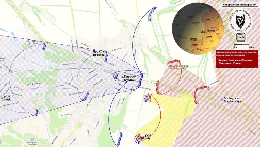 На Торецком участке Донецкого направления подразделения ВС РФ вошли в н.п.Шумы и освободили его. Одновременно с этим расширили зону контроля южнее железной дороги, ведущей в Кирово (оно же Пивничное или Северное), и продвинулись вдоль неë в самом этом населённом пункте.