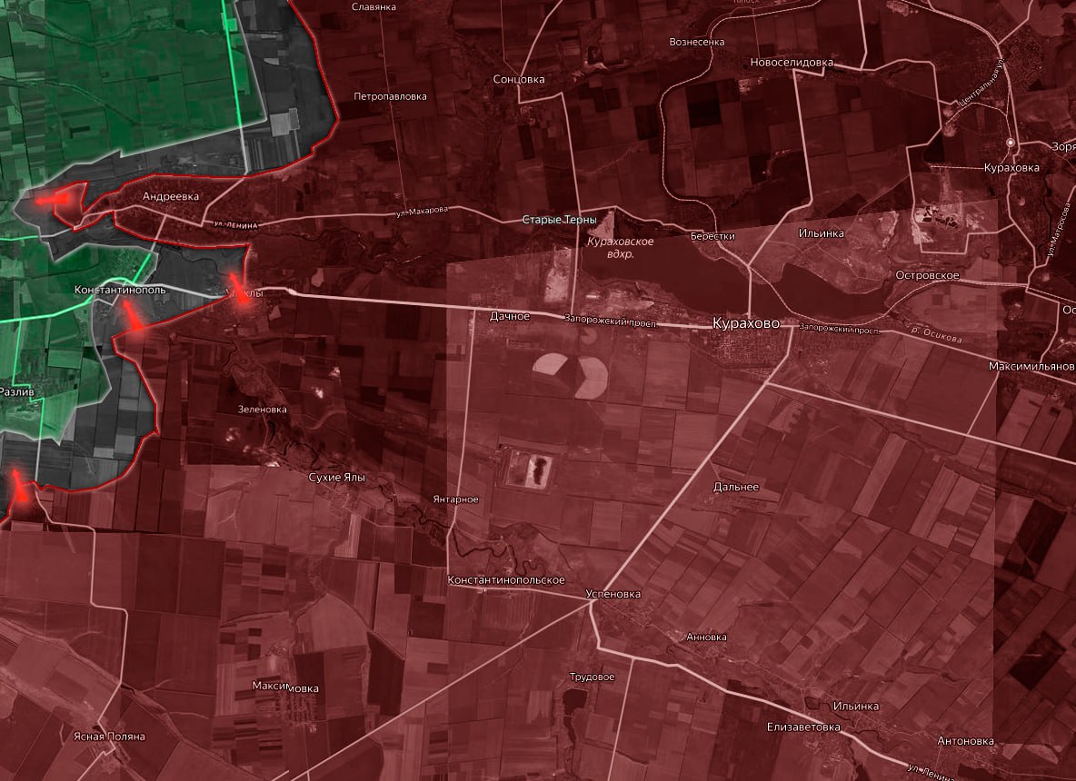 На Кураховском направлении продолжаются бои за Константинополь, который российские войска атакуют с нескольких направлений. Этот населенный пункт, наряду с Разливом, играет ключевую роль в обороне ВСУ. В случае его потери украинские силы будут вынуждены отступить к последнему крупному укрепрайону в этом секторе — н.п. Богатырь.