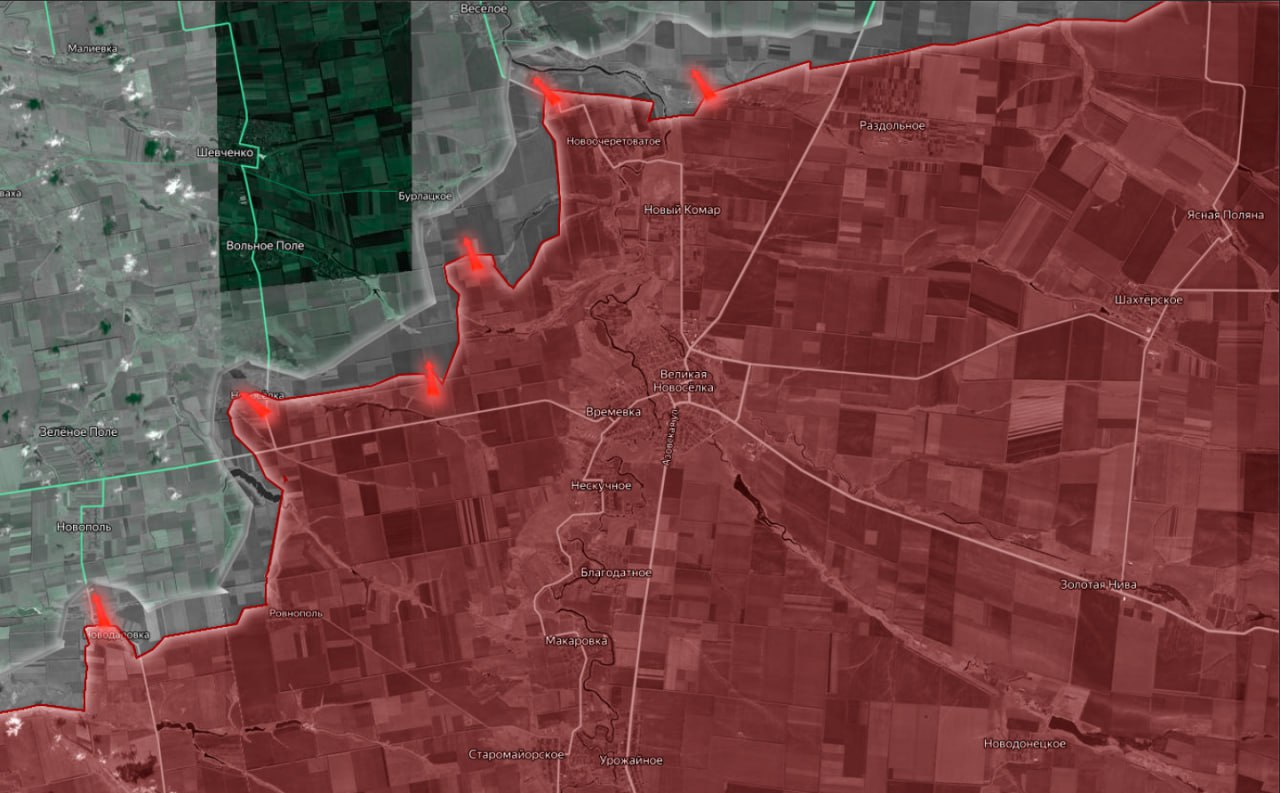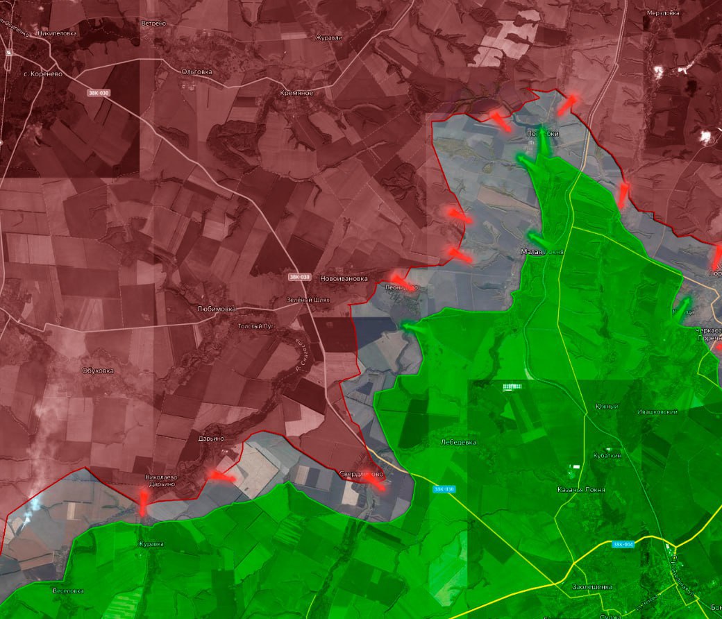 В Лебедевке и районе Гуево идут ожесточенные бои, российские силы пытаются закрепиться и расширить зону контроля. Также ВС РФ взяли под контроль Куриловку и развивают наступление в направлении Мелового, пытаясь продвинуться дальше на запад.