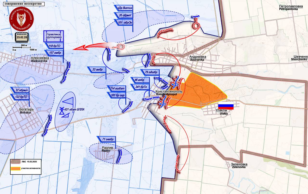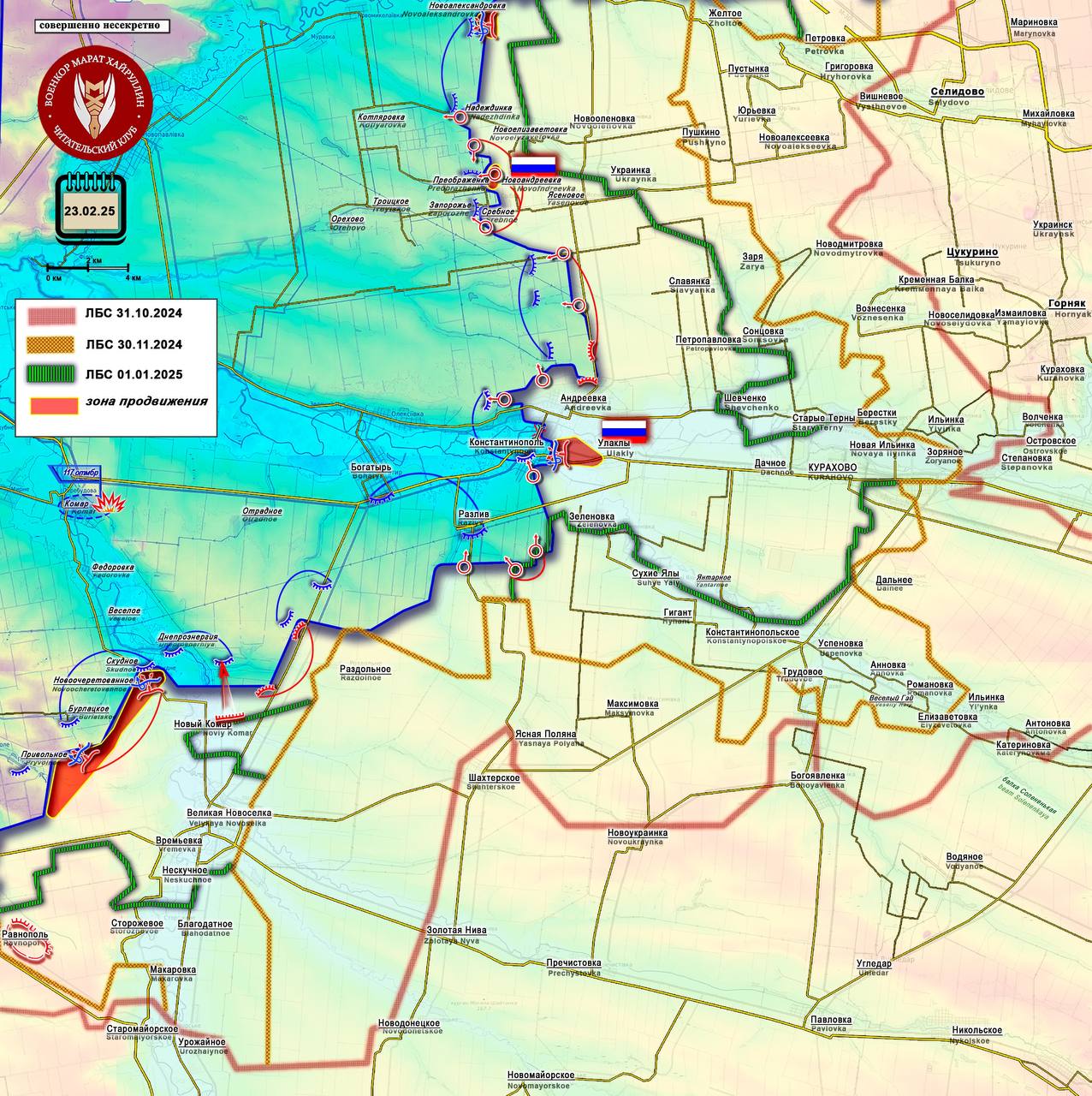 В Андреевке продолжаются бои. Наши бойцы расширяют контроль над территорией населённого пункта. Одновременно с её стороны развивается наступление в направлении н.п. Алексеевка. Идёт продвижение вдоль опорного пункта к северо-западу от Андреевки. Также идёт давление с Андреевки в направлении Константинополя. К последнему наши войска подошли вплотную с юга и востока. В самом населённом пункте начались уличные бои. ВС России интенсивно давят с востока, вынуждая противника откатываться к западным окраинам.