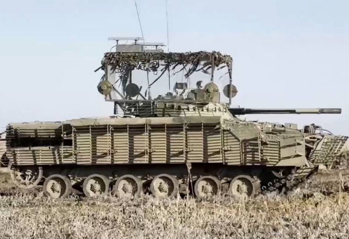Кадры ОК работы ударного вертолёта с применением ЛМУР по пункту управления БпЛА ВСУ.