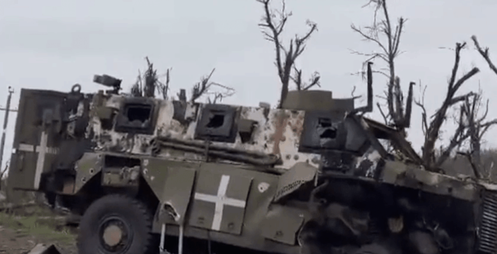 Уничтоженная БМП 2 (боевая машина пехоты) боевиков ВСУ и австралийский бронетранспортер Bushmaster в зоне проведения СВО