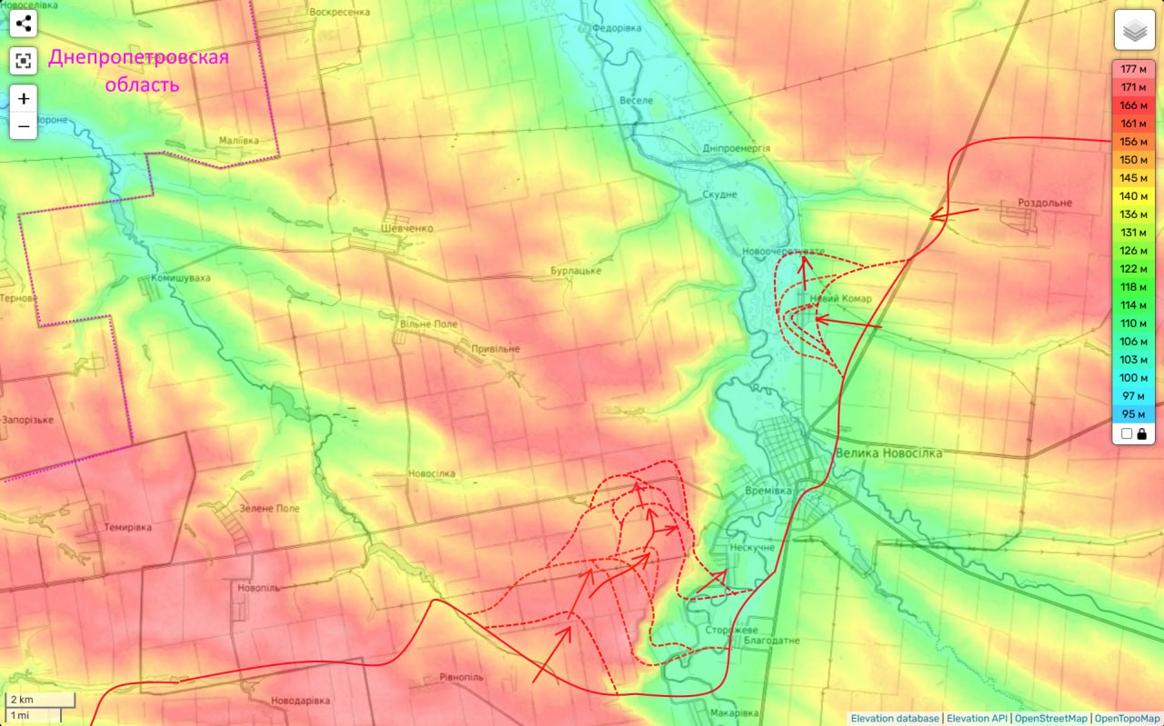 Начали появляться видеозаписи солдат ВСУ, которые, находясь в Большой Новосёлке, говорят, что они уже находятся фактически в окружении, а командование не отдает приказ на выход. Между тем, сейчас у частей противника в этом районе, остается пожалуй, последняя возможность это сделать. И это стало следствием крайних успехов ВС РФ западнее реки Мокрые Ялы. Где они последовательно берут под контроль холмы над Нескучным и Времеевкой. Причем, даже та грунтовая дорога, по которой, пусть и под непрекращающимся огнем еще можно как-то проникать в Большую Новоселку и выбираться из нее, уже практически находится под онгем из стрелкового оружия (правда, на предельных дистанциях). Но любой успешный наш здесь бросок превратит полукотел в Большой Новосёлке в настоящий котёл.