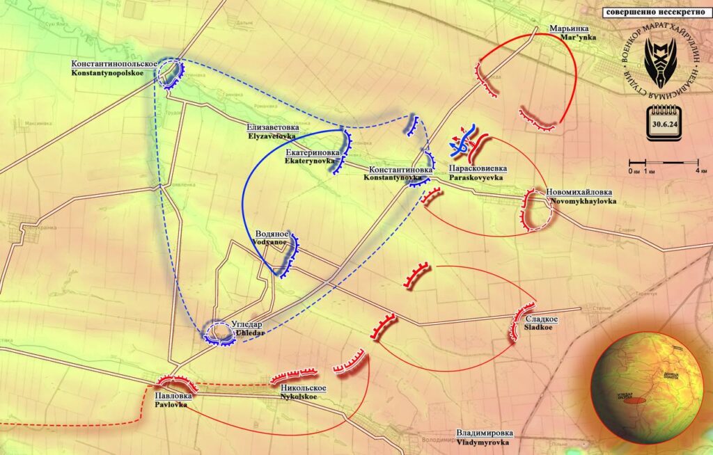 Покровское направление: на 30.06.24. Наши части, после взятия под контроль ключевых опорников севернее н.п. Сокол, а также зачистки последнего, продолжают наступать через Евгеньевку по направлению к н.п. Прогресс.