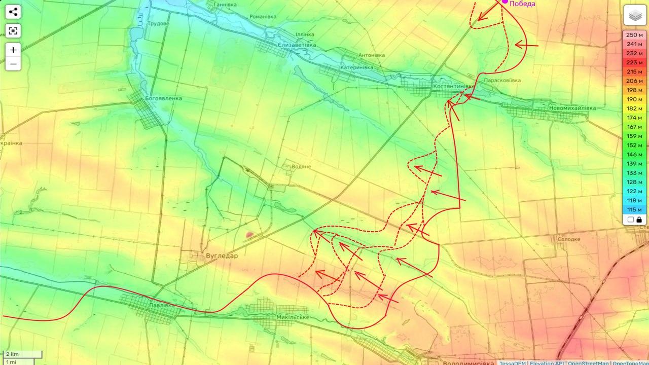 Угледарское направление (уточнение). Приходит информация, что после нашего прорыва по трассе от н.п. Победа на юг, противник, выводя свои части из-под угрозы отсечения от основных сил, отвел ночью свои опорники восточнее и юго-восточнее места прорыва. В целом, разумное решение. Особенно с учетом явной нехватки у противника здесь резервов.