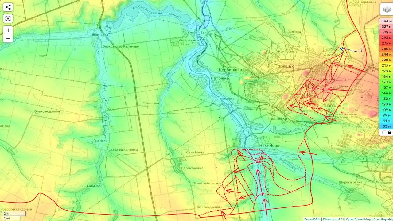 Торецкое направление: тиски сжимаются. Несмотря на отчаянное сопротивление противника и переброску сюда ранее резервов, наши части продолжают свое продвижение вперед. В н.п. Железное, они сумели довольно неплохо продвинуться в южной части города и вышли к террикону. Взятие его под свой контроль сильно усложнит логистику противника южнее между Железным и Нью-Йорком (Новгородским), так как горловинка окружения здесь уже и так стянута очень сильно, а утеря господствующей высоты поставит крест на попытках удерживать эту территорию.