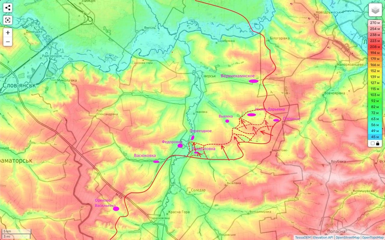Это продолжение их общего наступления на Северск с юга. А еще, данный успех открывает нам перспективу создания значимого плацдарма на западном берегу реки Бахмутка (выше ее слияния с рекой Васюковка) в районе н.п. Федоровка.