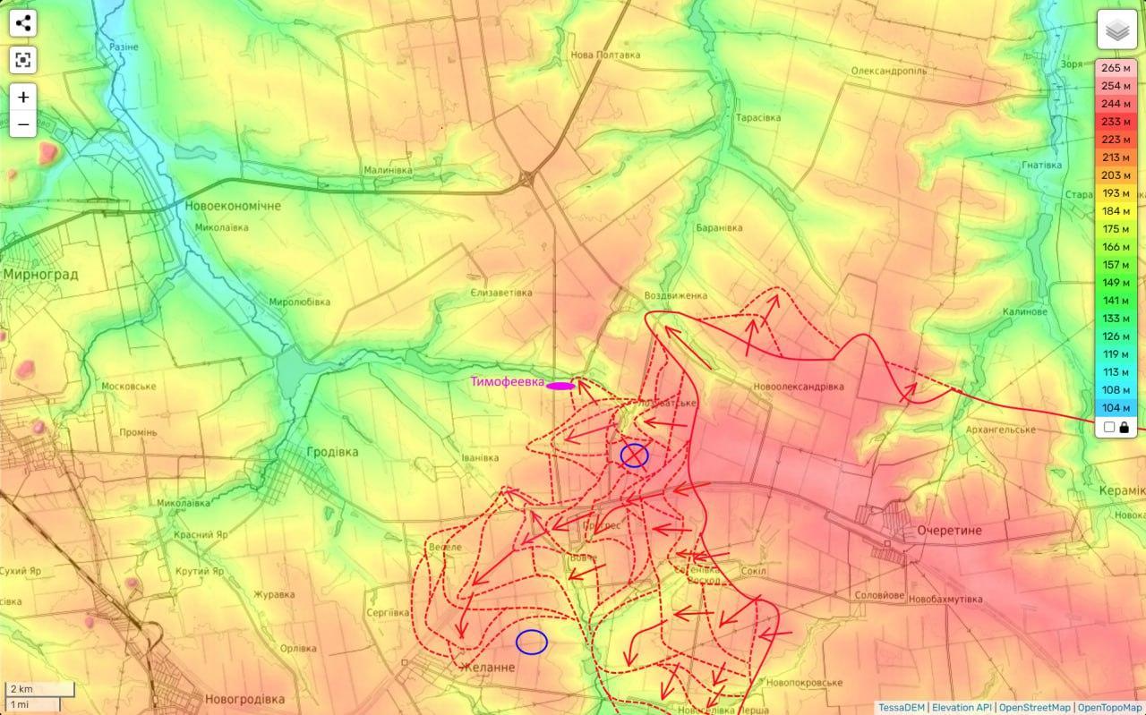 Покровское направление: Тимофеевка. Наши части продолжают наступление на Покровском направлении. Вчера в районе Желанного противник ввел в бой резервы и сумел приостановить наше продвижение вперед, но получил удар севернее. Где в районе Ивановки-Воздвиженки, наши части вынудили его оставить позиции севро-западнее н.п. Прогресс, чтобы не попасть там в окружение. А еще они решительным ударом вошли в населенный пункт Тимофеевка и там закрепились. Тем самым создавая угрозу своего дальнейшего продвижения в обход Ивановки и Воздвиженки. Таким образом, несмотря на переброску сюда и ввод в бой резервов, противник пока не сумел стабилизировать здесь ситуацию и каждый день вынужден сдавать свои позиции. Держим кулаки и молимся за наших парней.
