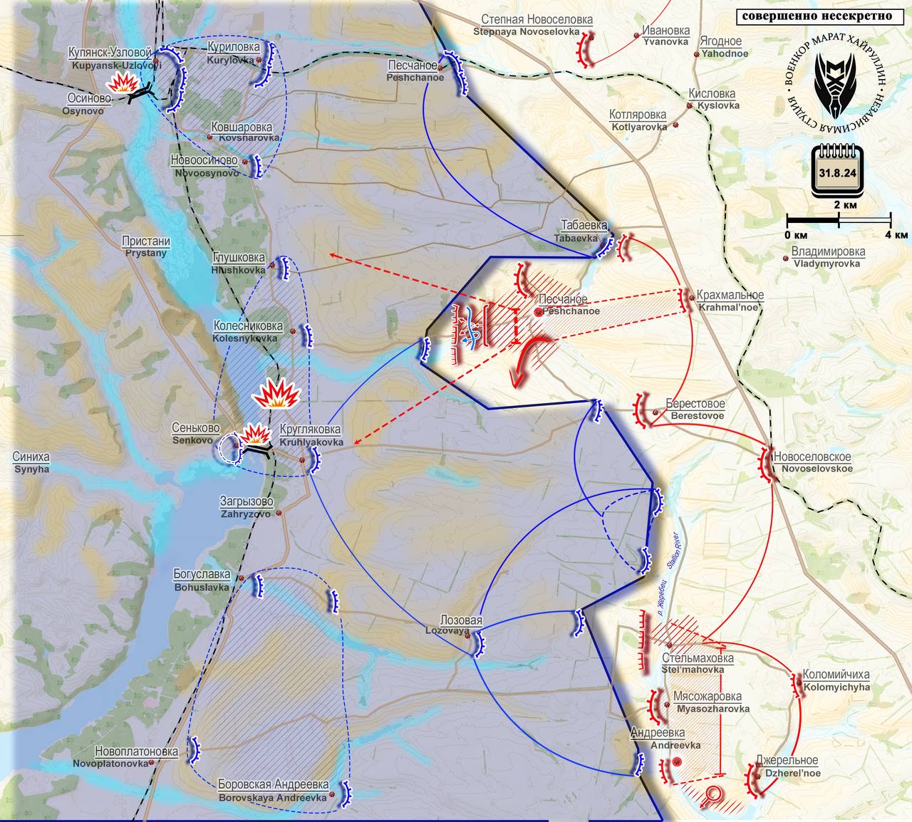 Купянское направление. На Купянском направлении ВС РФ расширили контроль западнее н.п. Песчаное в направлении н.п. Колесниковка. Также продвинулись от Песчаного на юг, обходя позиции ВСУ в районе н.п. Берестовое западнее их.