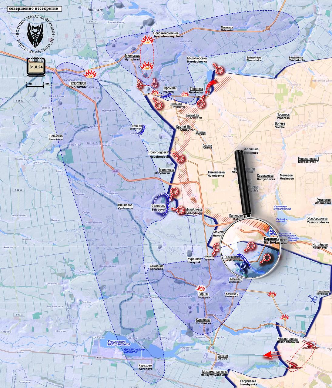 На Покровском участке Донецкого направления под контроль нашей армии перешëл населëнный пункт Карловка. Приходят сообщения, что противник также отступил из н.п. Галициновка. Таким образом, у наших подразделений есть ещë одна линия снабжения в район продвижения- участок трассы М30 (Е50) от Донецка до Селидово.
