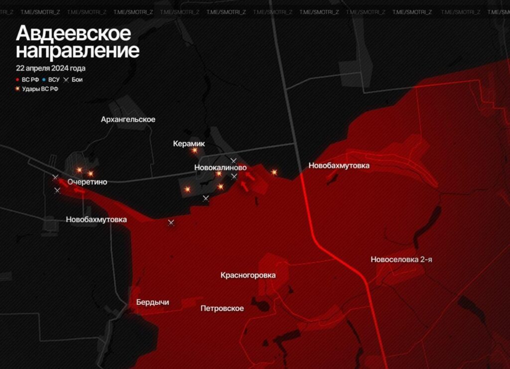 ВС РФ прорывают фронт на Авдеевском направлении. По данным «Иди и смотри», российские войска активно развивают наступление севернее Авдеевки.