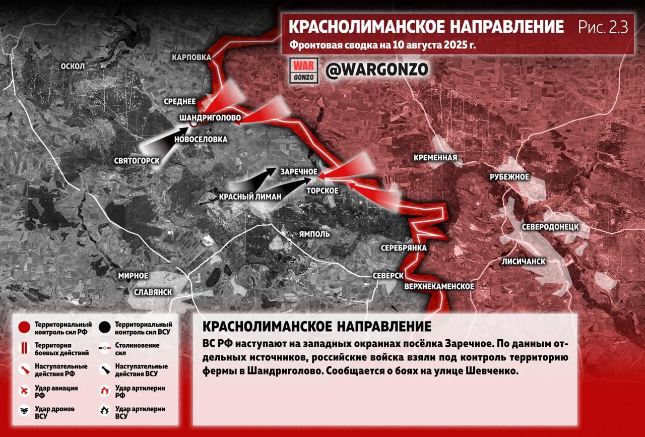 Краснолиманское направление. ВС РФ наступают на западных окраинах посёлка Заречное. По данным отдельных источников, российские войска взяли под контроль территорию фермы в Шандриголово. Сообщается о боях на улице Шевченко.