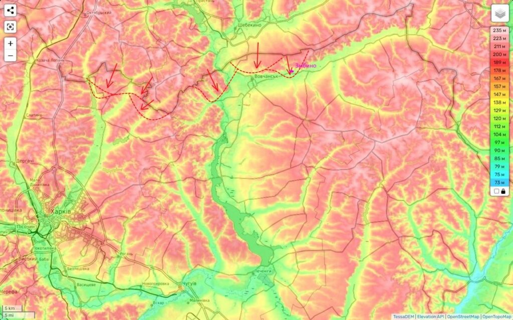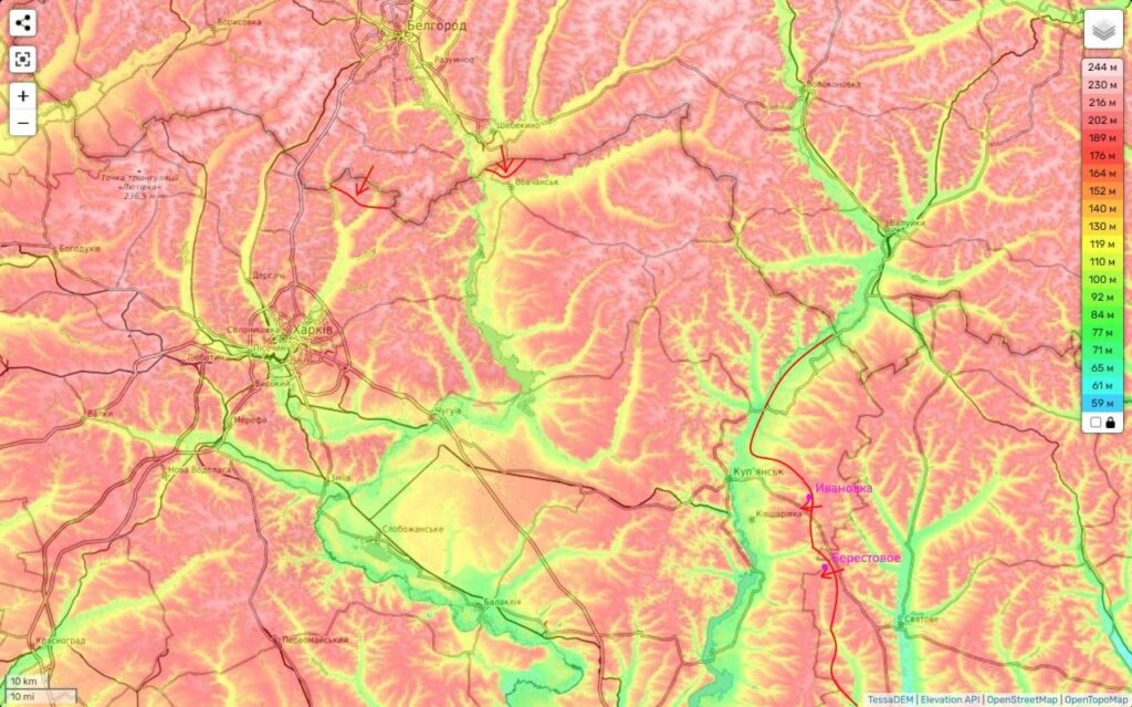 Сценарий третий — большая наступательная операция с севера. Если внимательно посмотреть на карту, то мы увидим, что штурм Купянска в лоб бессмысленен. Мы сможем подойти к реке (Осколу), но прорывать далее здесь оборону (с учетом ее форсирования и высокого западного берега) будет крайне трудно. Правильнее, нанести этой группировке удар в тыл через Волчанск, сковывая его локальными операциями по фронту (около Ивановки и Берестового).