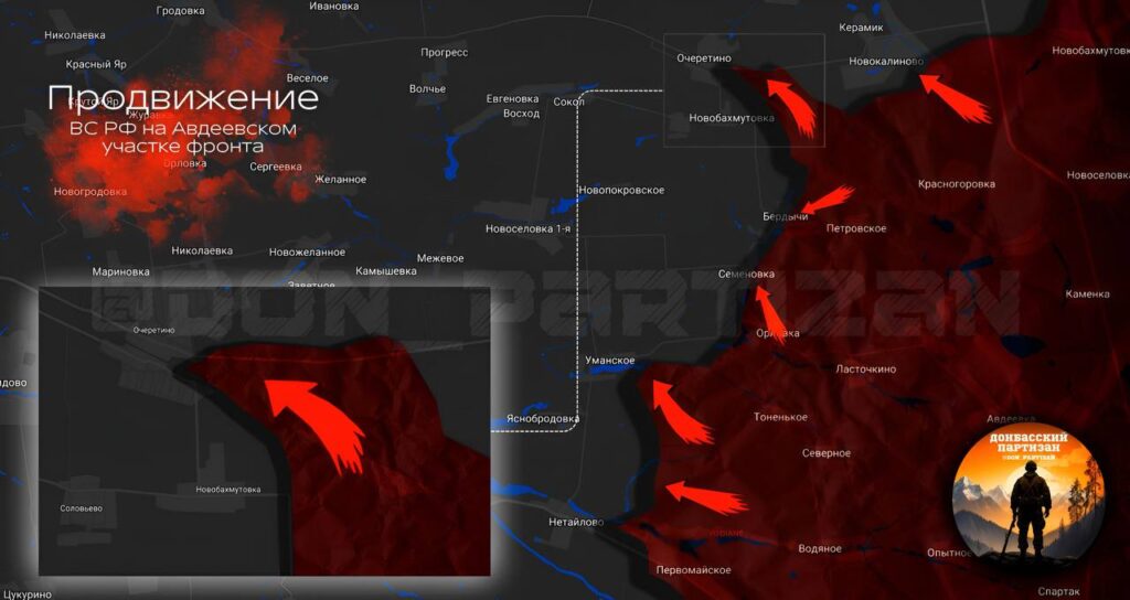 В центральной части Авдеевского участка фронта отмечается продвижение в районе Семеновки, где российские силы контролируют большую часть населенного пункта, однако на северных окраинах сохранятся присутствие противника.