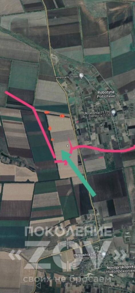 Текущая ситуация в Работино на Запорожском направлении из первых уст от наших штурмовиков: Красным отмечена линия реальная. Красная линия — реальная линия боевого соприкосновения, которая проходит западнее Работино. Соответсвенно часть Работино с западной стороны под нашим контролем. Но с западной стороны есть еще одна лесополоса, которую мы еще не забрали.
