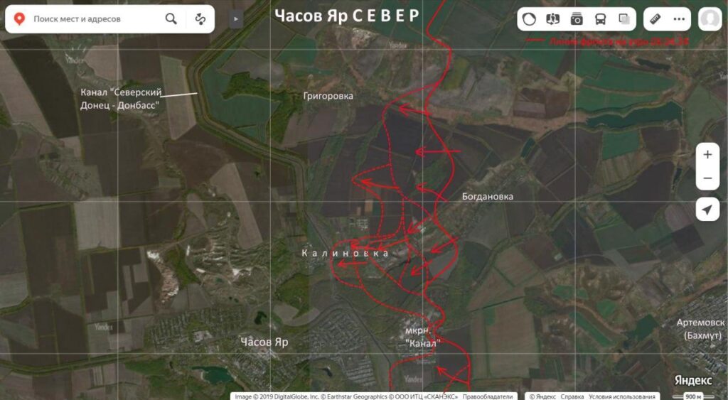 ЧасовЯрское направление: Калиновка. Появилась информация, что нам таки удалось выйти на линию канала «Северский Донец-Донбасс» в районе Клиновки. Противник держался там долго и упорно, понимая, что если нам это не удастся, то многие достижения майского штурма могут быть сведены на нет.