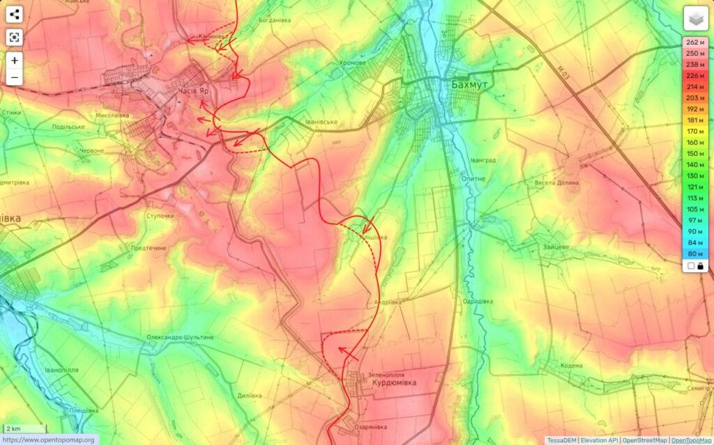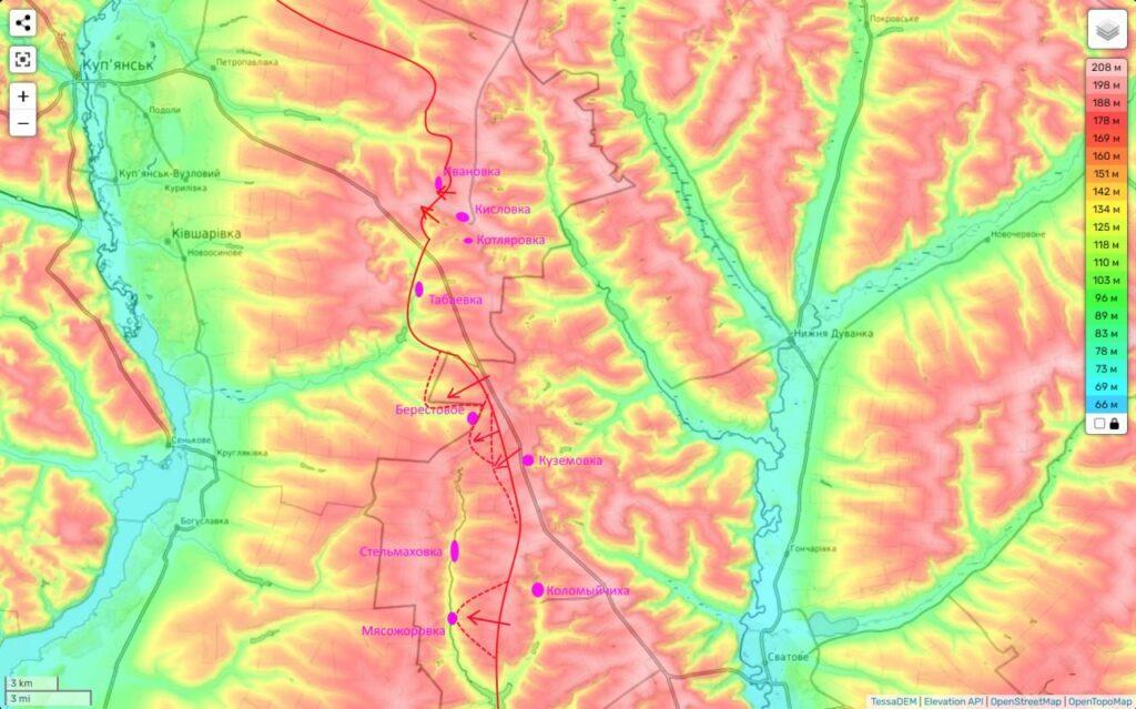 Первый в районе Берестового, где смогли продвинуться и взять еще с одного направление «во фланг» населенный пункт, который теперь по сути в низине зажат между нашими войсками и противнику здесь ловить уже нечего. Лучшее для него ночью попытаться вывести остатки гарнизона и попытаться удерживать наши части западнее Берестового в самой узкой части водораздельного хребта (шириной здесь всего несколько сот метров).