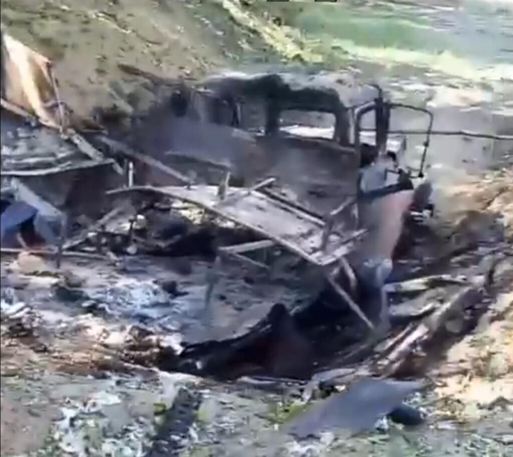 FPV-дрон ВС РФ поразил автомобиль подвоза боеприпасов ВСУ. Грузовик полностью выгорел, цель уничтожена