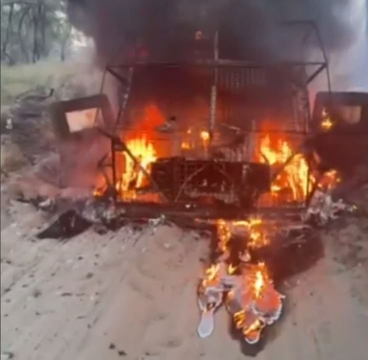 Еще один догорающий бронеавтомобиль «Humvee» украинских формирований после встречи с русским FPV-дроном, где-то на фронте