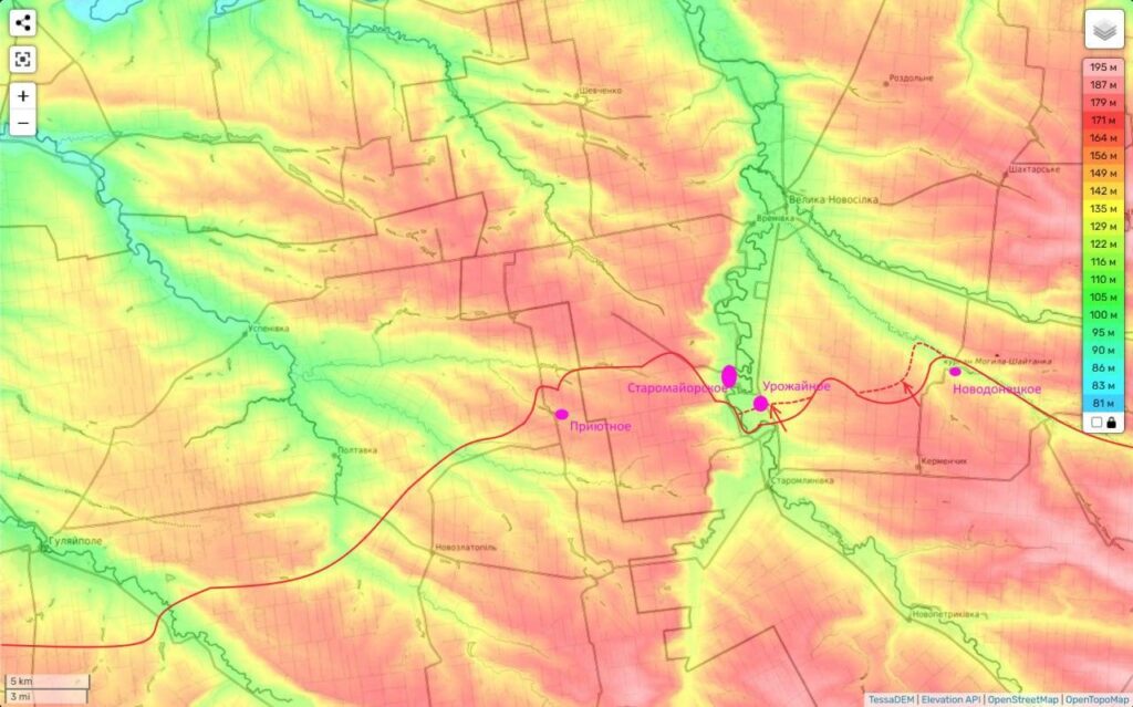 Здесь важен контроль над высотами западнее этого н.п. и он у нас уже есть. Если нам удастся еще хоть немного здесь продвинуться, участь гарнизонов ВСУ в Старомайорском и Урожайном будет предрешена.