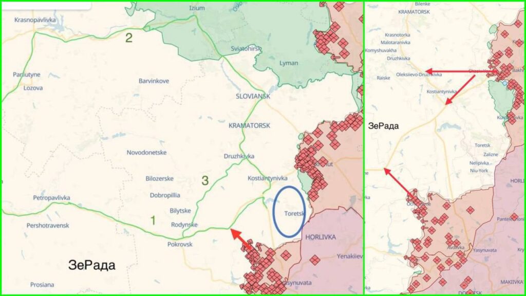 Группа войск ВСУ, которая обороняет единственный, не сдвинувшийся участок фронта в районе Торецка и Нью-Йорка, снабжается по трассе Павлоград-Покровск-Константиновка (1). Из крайней точки Очеретинского прорыва ВС РФ до нее осталось 11 километров.