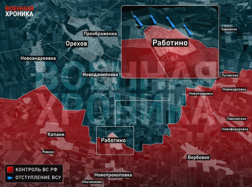 Куда важнее дальнейшее движение от Работино, Копаней и Вербового на север в сторону Орехова. Оттуда ВСУ продолжают проводить беспокоящие российскую пехоту рейды. Нельзя сказать, что эти рейды многочисленные, но они есть.