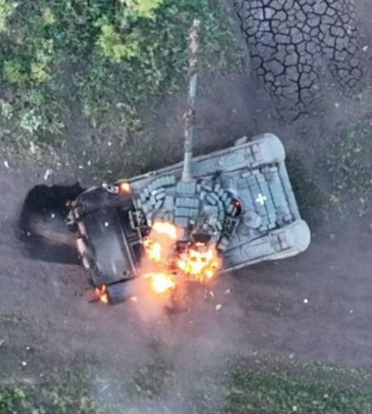 Ланцет догоняет и поражает украинский танк на марше. Судя по всему, произошло внутреннее возгорание и денацификация одного из танкистов. Это объясняется, почему из танка сбежало два укропа.