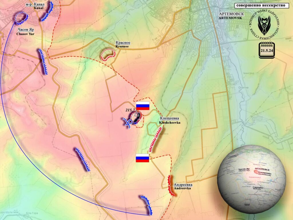 Одновременно мы ударили и в районе Андреевки, так же продвинувшись вперёд. В ближайшее время можно ожидать выравнивания линии столкновений на участке Курдюмовка- Клещеевка. А в недалëкой перспективе и на участке Часов Яр- Курдюмовка по линии канала.