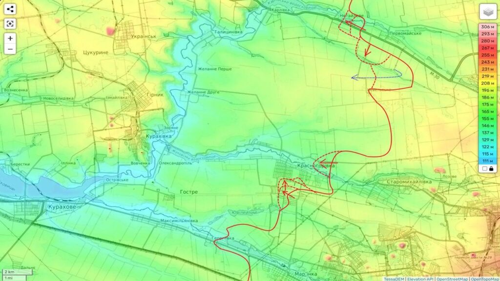 И так практически везде. Сейчас мы пошли на юг от Новобахмутовки, что обнуляет сильную позицию ВСУ под Уманским. Заход по водоразделу южнее Сокола обнулит значимость позиций в районе Новопокровского и Новоселовки Первой.