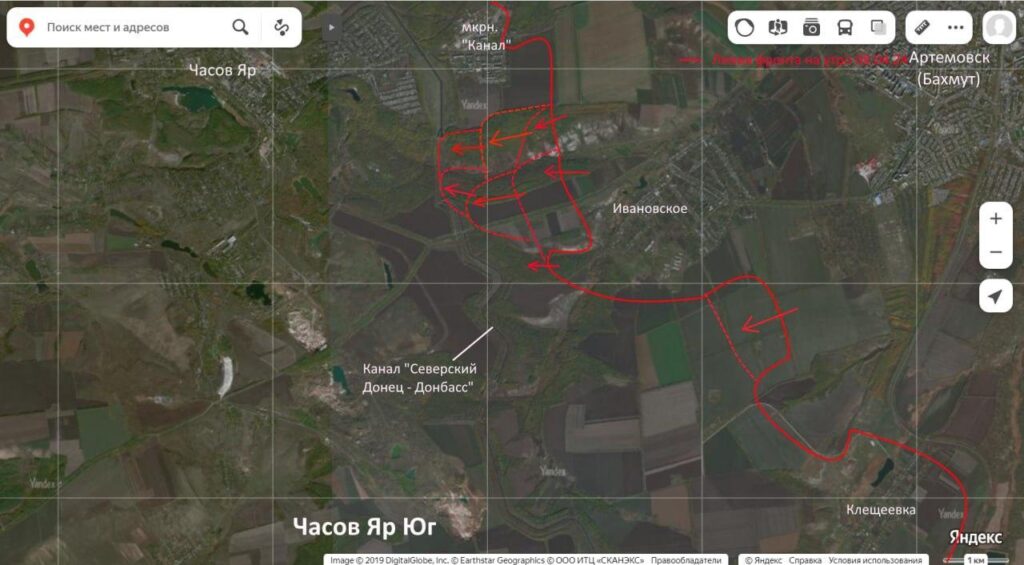 Вчера наши части из района Ивановского продолжали двигаться вперед и смогли зачистить район труб канала «Северский Донец-Донбасс», который расположен южнее Часова Яра. Эта, густо поросшая лесом местность, очень удобна для охвата города и проникновения в него наших штурмовых частей. А отсюда и то ожесточение, с которым противник держал здесь оборону. Но он был сломлен и отступил.