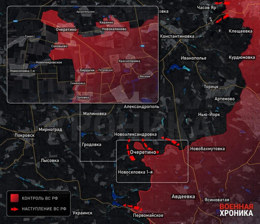 После этого ВС РФ смогут продолжить движение вдоль ключевых высот на запад от Очеретина по железной дороге, из-за чего бывший авдеевский гарнизон ВСУ (предварительно изолированный от сил прикрытия) может оказаться под угрозой оперативного окружения.