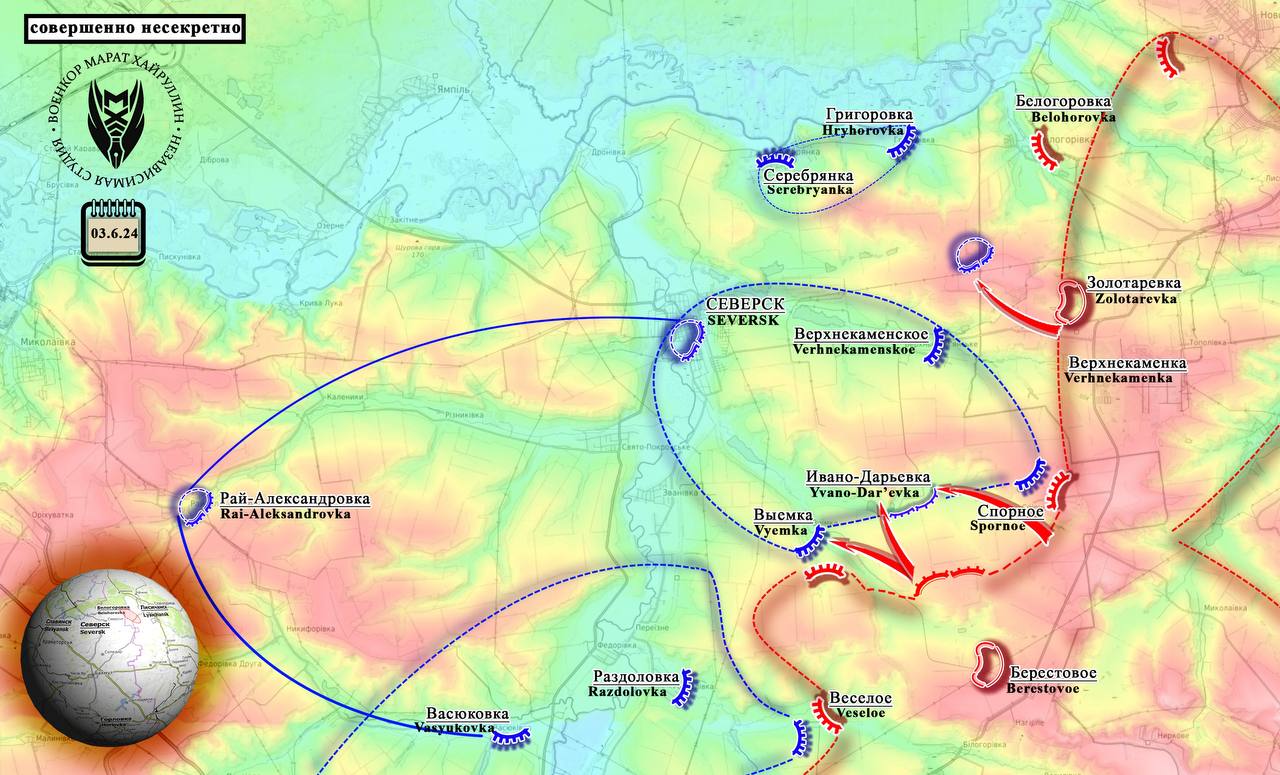 На Северском направлении ВС РФ активно атакуют в районе Спорного, которое частично под нашим контролем. Чуть ранее там были продвижения наших северо-восточнее села. А теперь мы продвинулись и закрепились юго-западнее по направлению от Берестового к Ивано-Дарьевке. То есть укропы, сидящие в районе села, сейчас находятся в клещах. По самой Ивано-Дарьевке также постоянно наносятся удары.